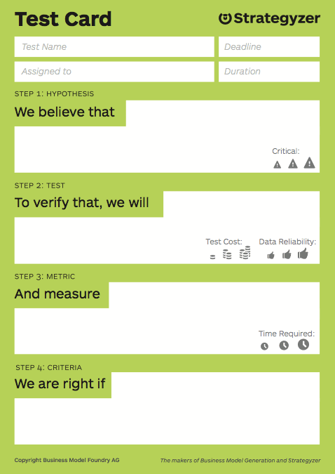 Escreva suas hipóteses com método. Ferramentas como os Test Cards do Strategyzer ajudam a dar clareza ao que está sendo testado e ao que se espera aprender. Depois de escritas, priorize as hipóteses com base em impacto potencial e grau de incerteza. Vá do mais arriscado ao mais importante. Execute os testes, colete dados reais e registre os aprendizados com Learning Cards.